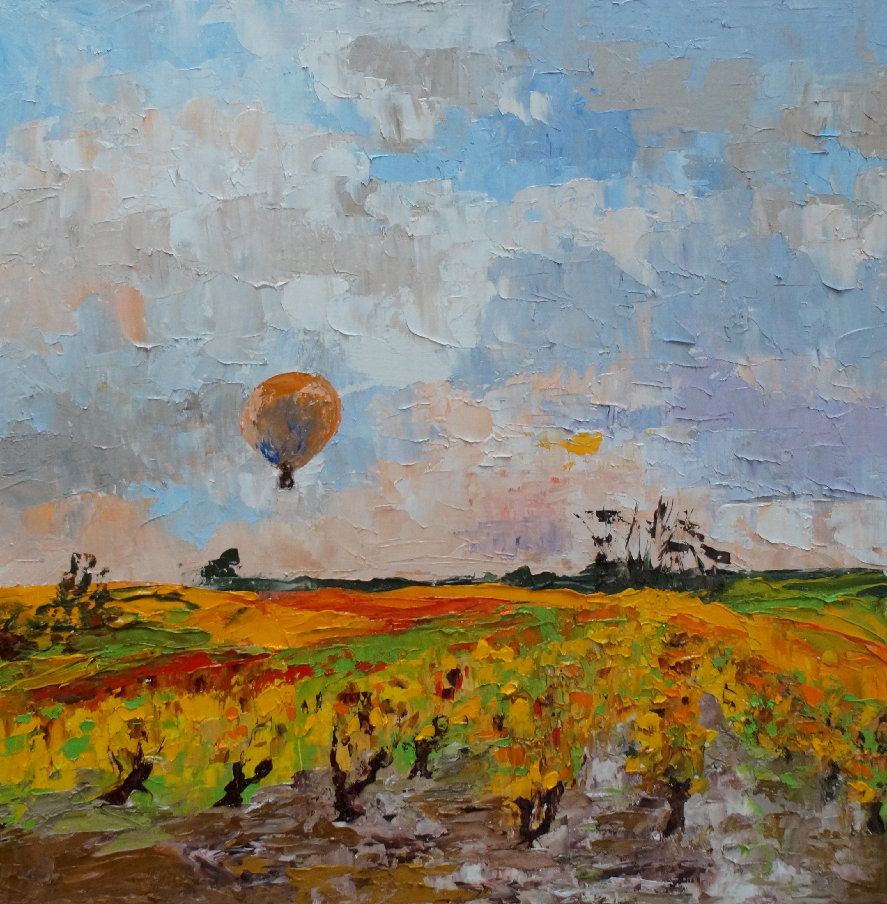 Balloon in the Setting Sun oil on board plein air 16″x16″ £ 275