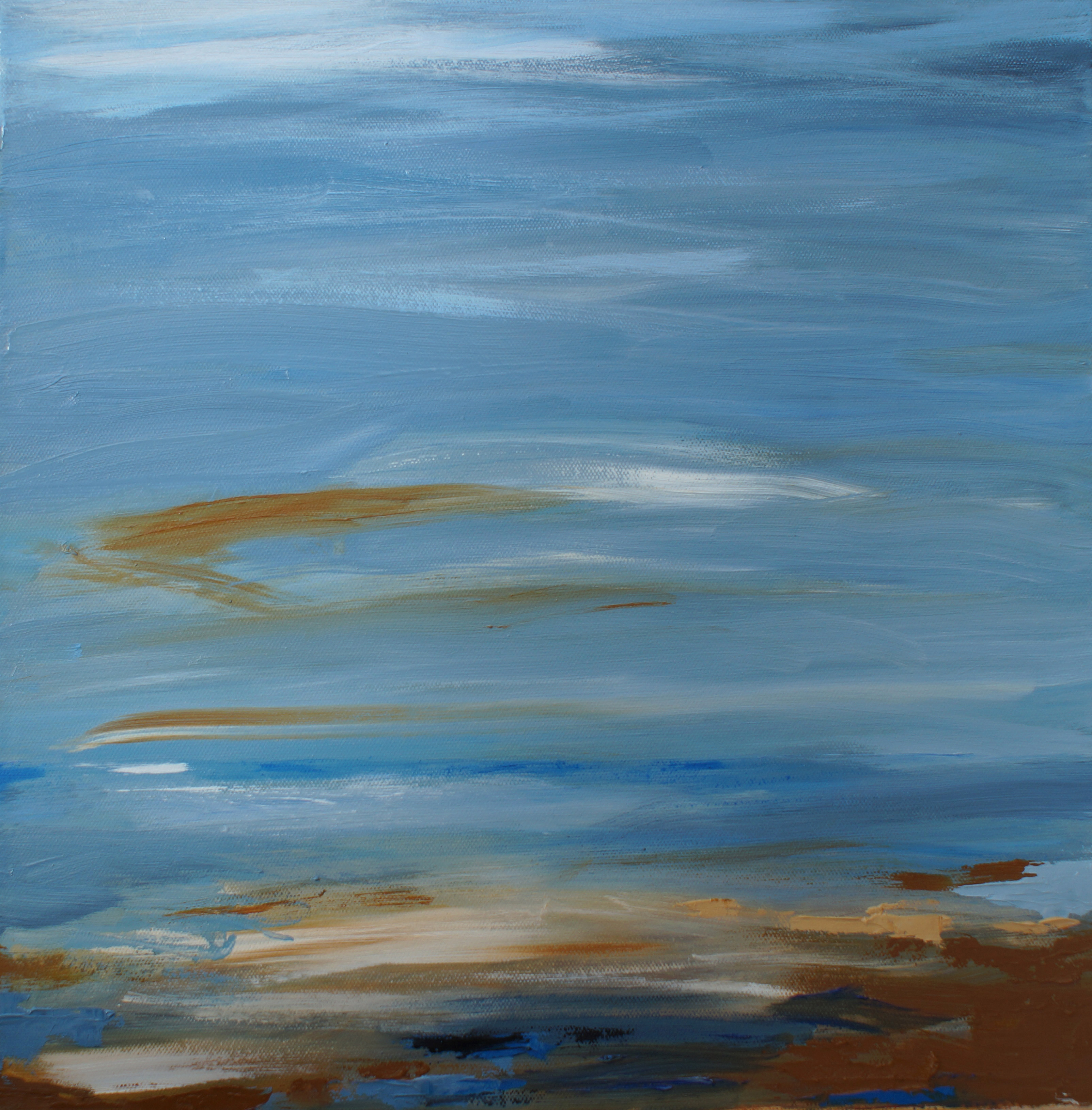 A sea of blue from my imagination inspired by numerous painting excursions to the coasts in Kent and Cornwall. The painting is set in a beautiful white wood floater frame and ready to hang.