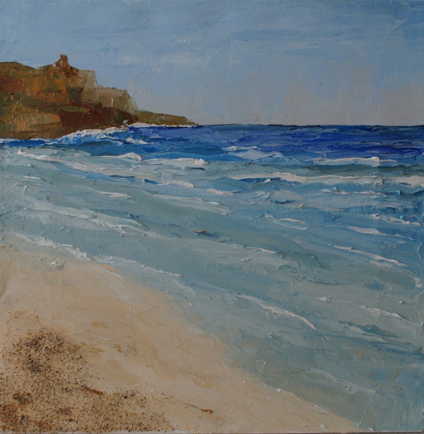 Porthmeor Beach plein air painting oil on hand stretched canvas 16″ x 16″